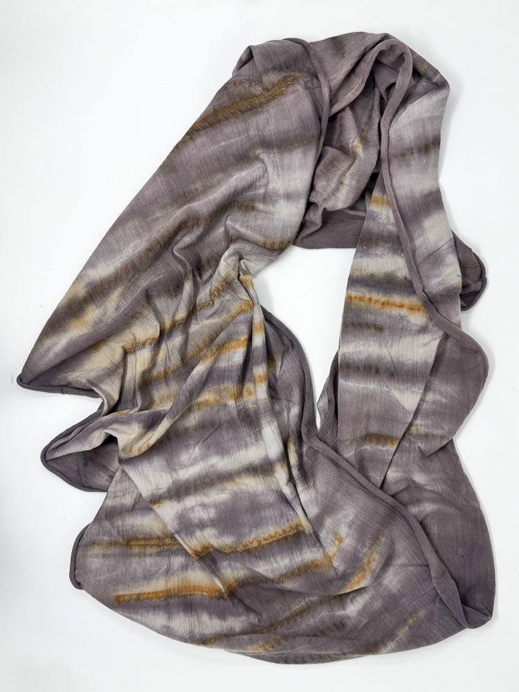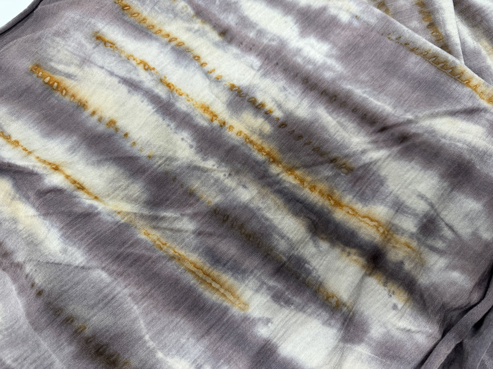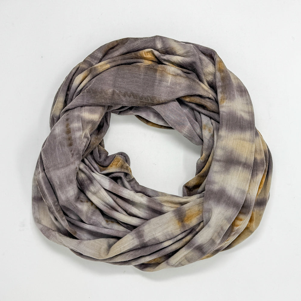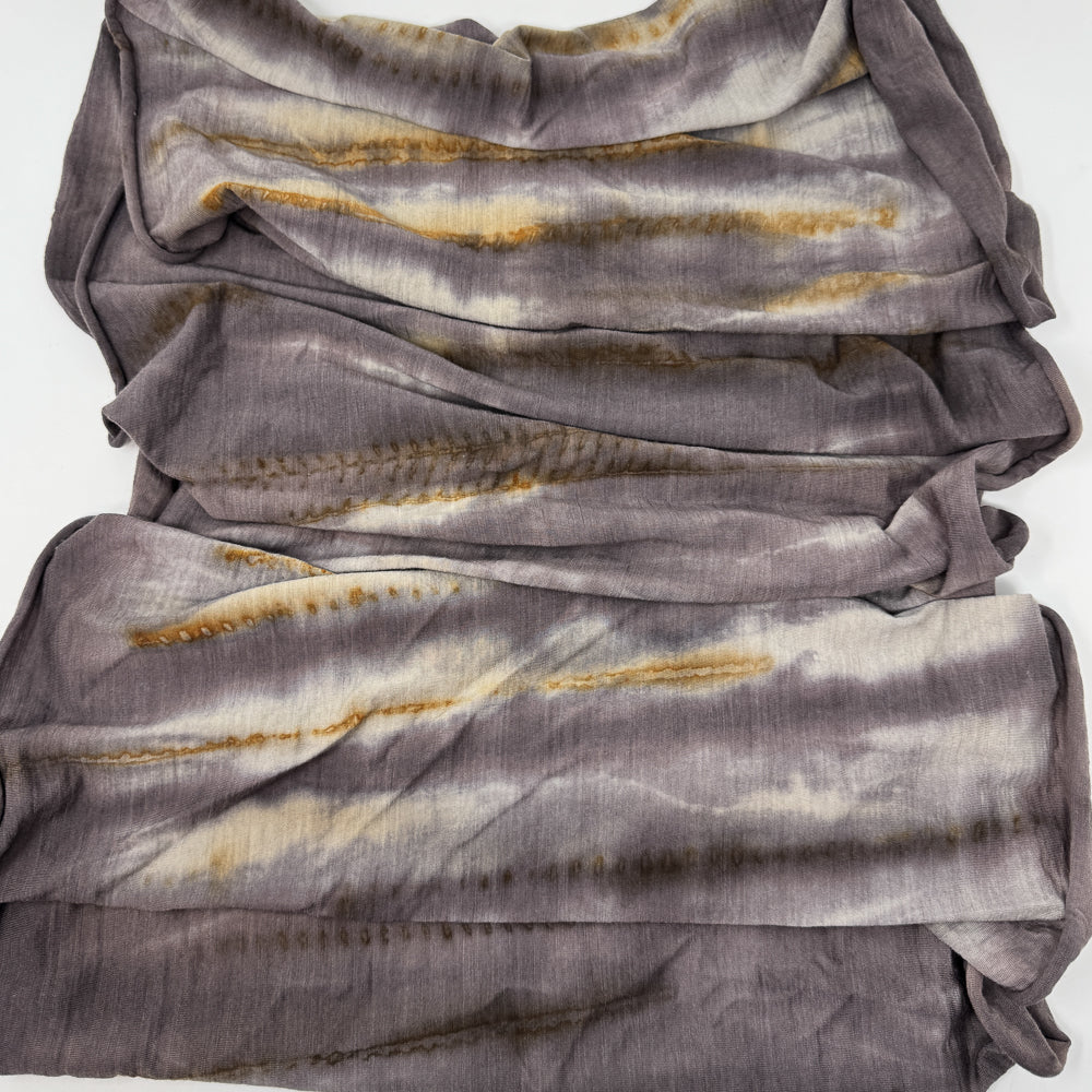 Rust printed with rebar and overdyed with ground myrobalan nut, this infinity scarf will add a bit of flair (and warmth) to any outfit! The edges are left to roll naturally which allows you to flip the scarf inside and out for a slightly different look.