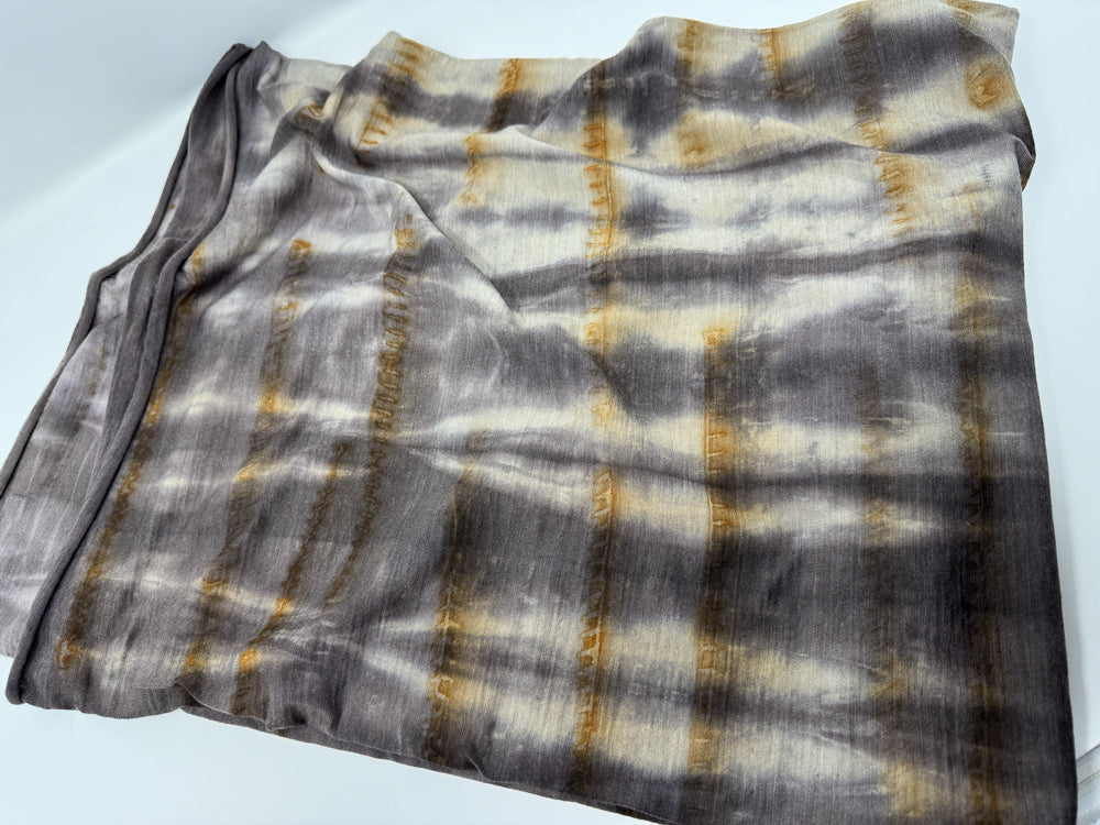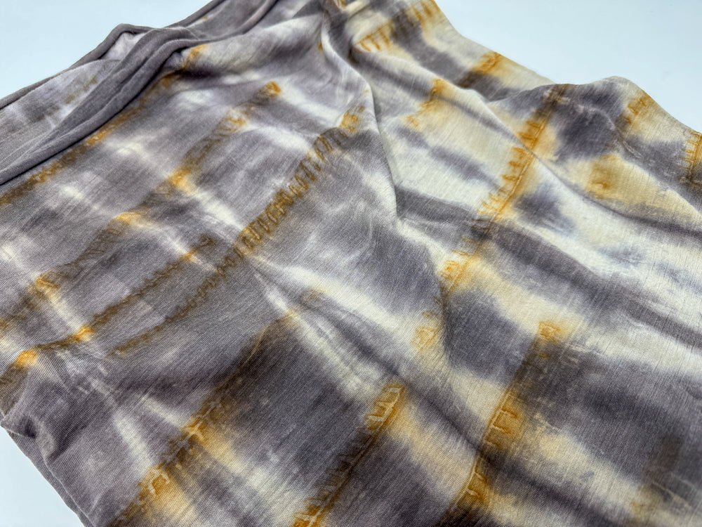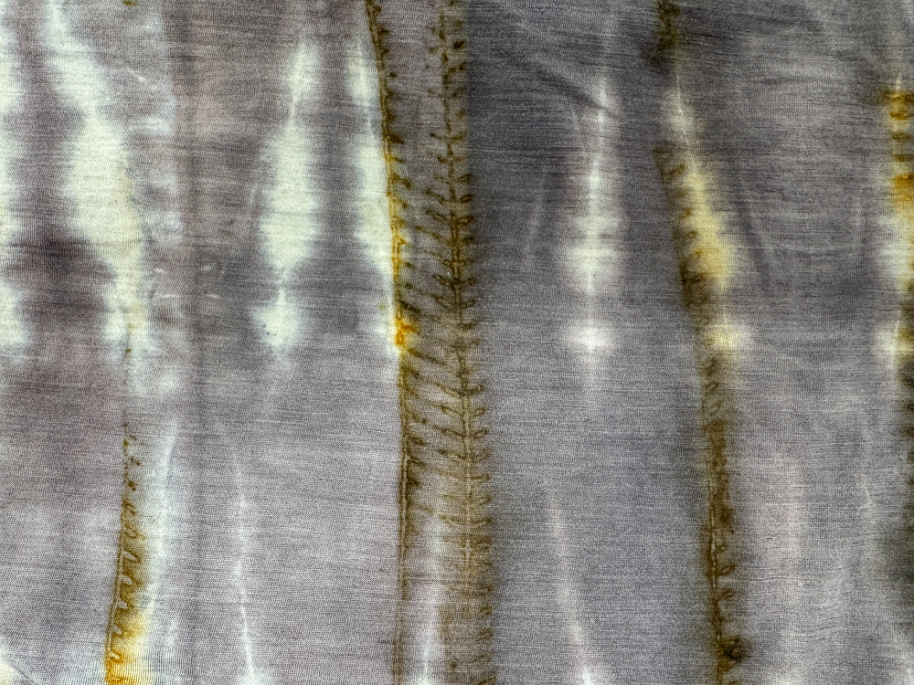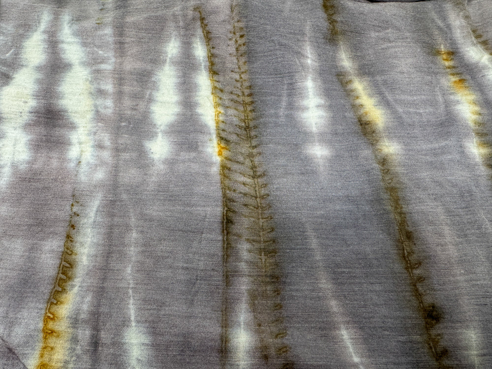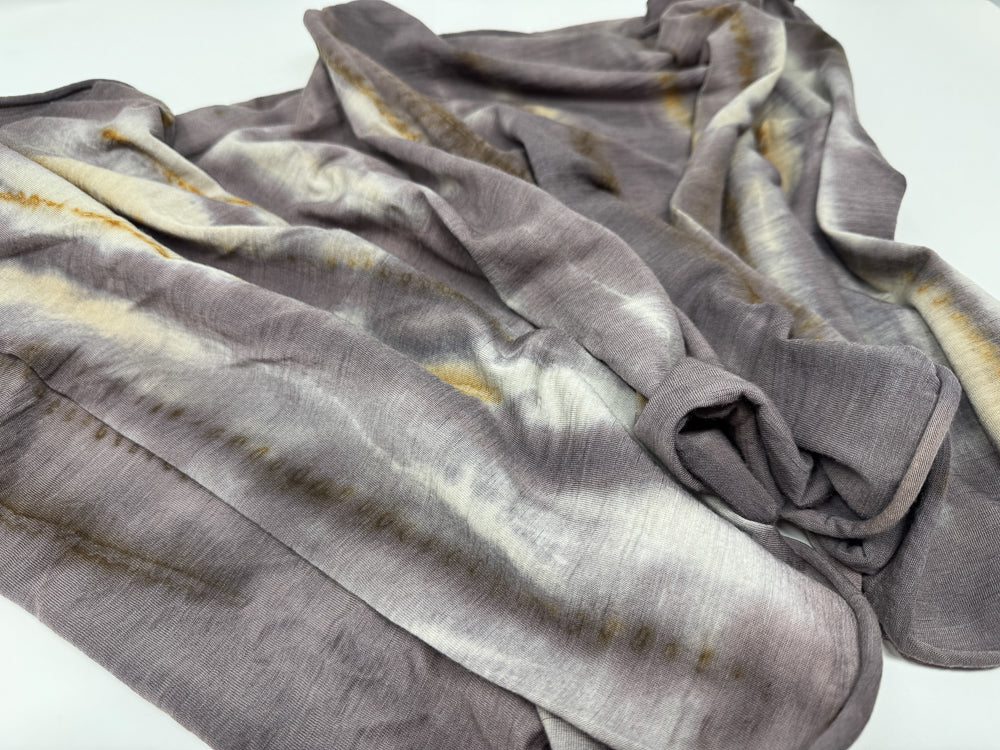 Rust printed with rebar and overdyed with ground myrobalan nut, this infinity scarf will add a bit of flair (and warmth) to any outfit! The edges are left to roll naturally which allows you to flip the scarf inside and out for a slightly different look.