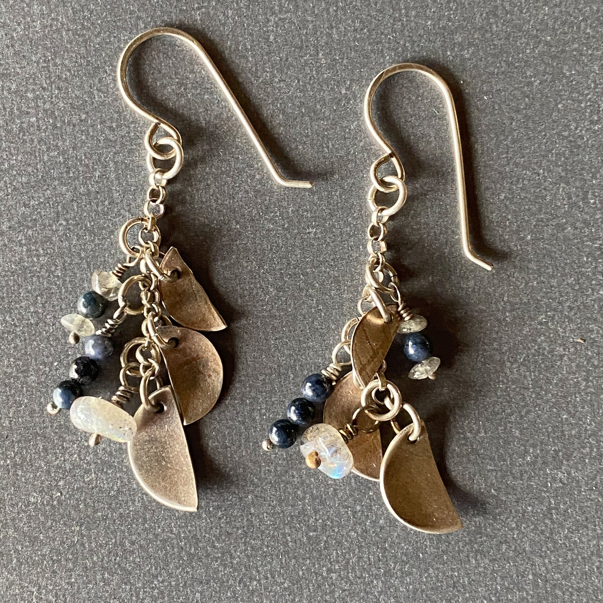 These one-of-a-kind sterling silver half moon dangle earrings feature a variety of semi-precious beads. The silver half moons are recycled and formed from the topographic map offcuts from my pendant pieces. The jump rings, chain, and ear wires are sterling silver. The earrings come with silicone earring backs to prevent loss.